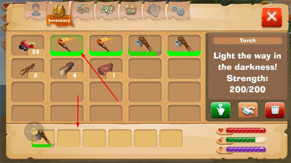 1、管理物品欄,使用火把在黑暗中照明,保障探索安全,開(kāi)啟探索之旅。