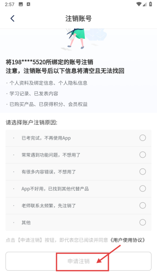 4、在注銷賬號頁面,選擇注銷原因后,點擊申請注銷按鈕,即可發(fā)起賬號注銷操作。