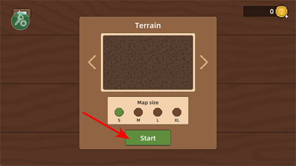 1、在游戲中,點(diǎn)擊Start按鈕開始游戲,這是進(jìn)入地圖建設(shè)和戰(zhàn)斗環(huán)節(jié)的關(guān)鍵操作,選擇地形尺寸開啟游戲。