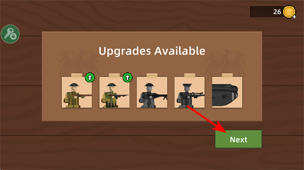 2、點(diǎn)Next按鈕查看升級(jí)選項(xiàng),升級(jí)操作是強(qiáng)化士兵戰(zhàn)力的核心步驟,選擇合適的升級(jí)可提升軍隊(duì)的攻擊能力。