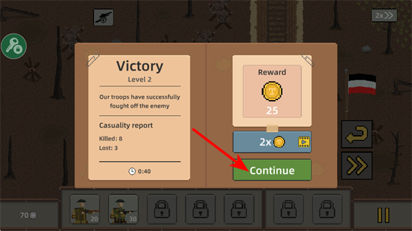4、關(guān)卡勝利后點(diǎn)擊Continue按鈕繼續(xù)游戲,繼續(xù)操作可進(jìn)入下一關(guān)挑戰(zhàn),不斷提升軍隊(duì)實(shí)力以應(yīng)對(duì)更難的戰(zhàn)斗。