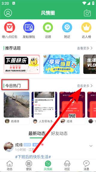 2、在風(fēng)情圈頁(yè)面,找到今日熱門(mén)板塊,點(diǎn)擊查看更多。