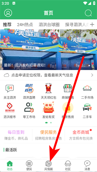 1、打開(kāi)泗洪風(fēng)情網(wǎng),點(diǎn)擊底部導(dǎo)航風(fēng)情圈,進(jìn)入頁(yè)面。