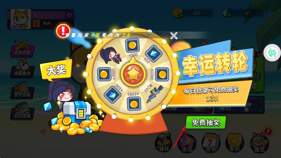 1、參與幸運轉(zhuǎn)輪活動,每日登錄可免費抽獎1次,有機會獲得金幣、鉆石、限量角色、武器等獎勵。