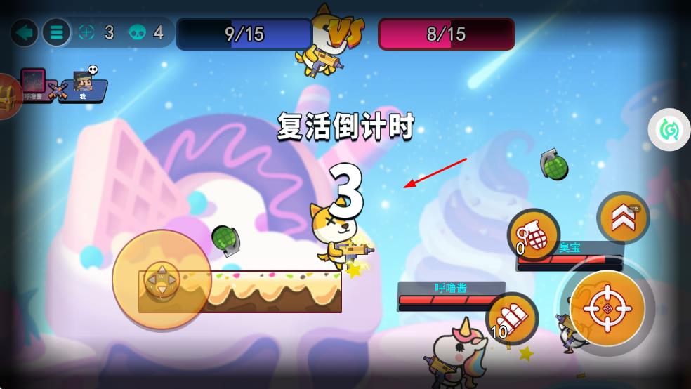 4、戰(zhàn)斗中被擊敗后,會觸發(fā)復(fù)活倒計時,倒計時結(jié)束后復(fù)活繼續(xù)參與戰(zhàn)斗,爭取對戰(zhàn)勝利。