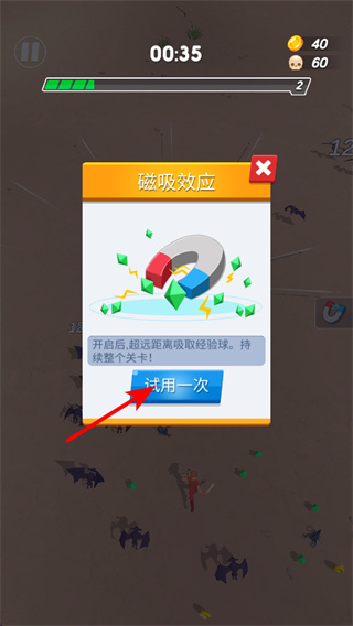 4、試用磁吸效應(yīng)道具,道具使用是加速資源收集的重要操作,試用后可超遠(yuǎn)距離吸取經(jīng)驗(yàn)球,快速提升英雄等級(jí),增強(qiáng)能力。
