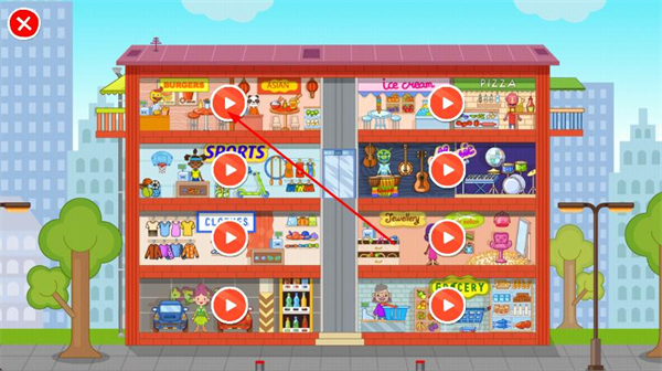1、在超級(jí)商店的樓層界面,點(diǎn)擊不同店鋪的播放按鈕,進(jìn)入對(duì)應(yīng)的店鋪場(chǎng)景。