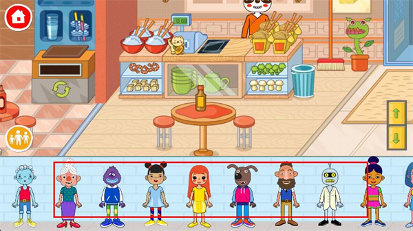 3、在角色選擇欄中,滑動(dòng)選擇喜歡的角色,將其放入店鋪中,與店內(nèi)元素互動(dòng)。