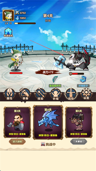 4、持續(xù)挑戰(zhàn)后續(xù)關(guān)卡如第5關(guān),利用升級后的裝備和技能,自動消滅敵方怪物,達成通關(guān)目標。
