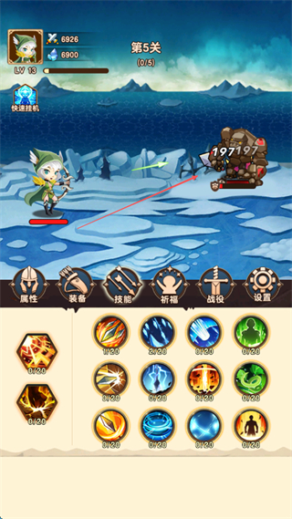 3、在技能界面,升級攻擊類技能如火焰箭、閃電箭等,增強輸出能力,快速消滅高血量敵人如藍色巨龍。