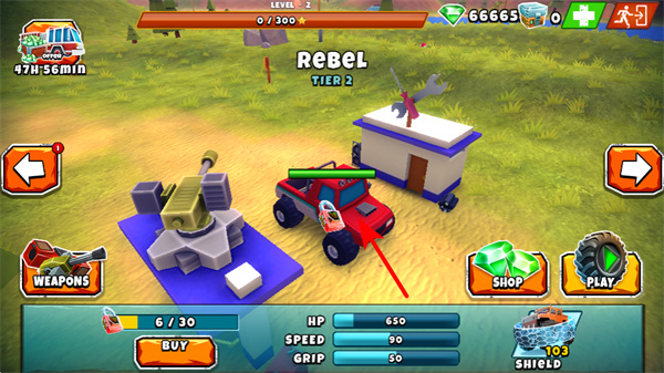 3、查看車輛屬性并進行武器購買,屬性與武器管理是增強戰(zhàn)力的關(guān)鍵環(huán)節(jié),購買武器后可提升車輛的攻擊能力,應對更強大的敵人。