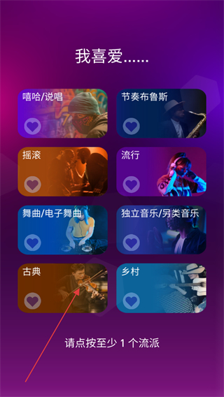1、打開游戲根據(jù)系統(tǒng)提示至少選擇一個自己喜愛的歌曲風(fēng)格,可以選擇多個風(fēng)格。