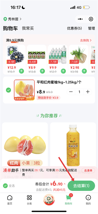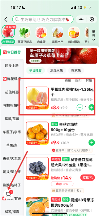 2、在水果鮮花頁面,選擇商品加入購物車,進(jìn)入購物車頁面。