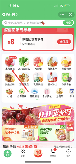 1、在樸樸超市首頁,點(diǎn)擊水果鮮花分類選項(xiàng),進(jìn)入水果鮮花頁面。