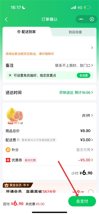 4、在訂單確認(rèn)頁面,點(diǎn)擊去支付按鈕,完成商品下單操作。