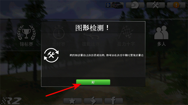 1、在游戲中,點(diǎn)擊好按鈕完成圖形檢測(cè),檢測(cè)完成是進(jìn)入游戲的關(guān)鍵操作,點(diǎn)擊可正式開啟賽車生涯,體驗(yàn)賽車模式。