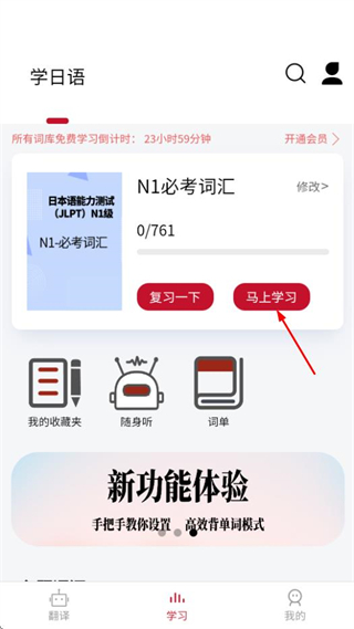 2、在學日語頁面,點擊馬上學習按鈕,進入日語詞匯學習頁面。