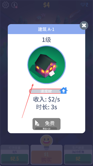 2、建造建筑A-1,該建筑1級時收入$2/s,時長3s,可免費加速。