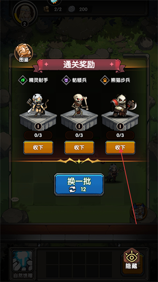 1、每通過一個關(guān)卡能獲得一次通關(guān)獎勵可以選擇一個角色進行獲取。