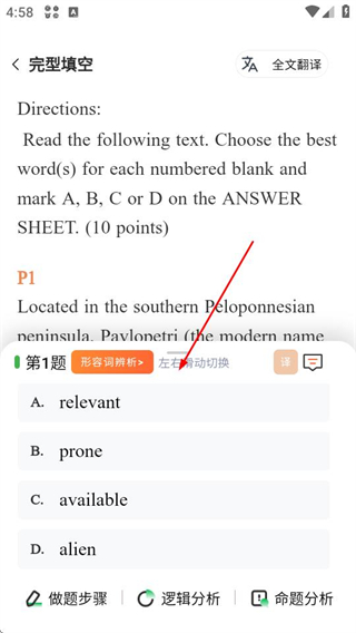 4、在完型填空題目作答界面可進行題目作答,查看選項解析等操作