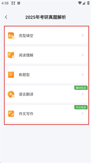 完整覆蓋考研英語完形填空、閱讀理解、新題型、翻譯、寫作等全部題型,每個題型配套專項訓練與解析,無需切換工具即可完成系統(tǒng)學習。